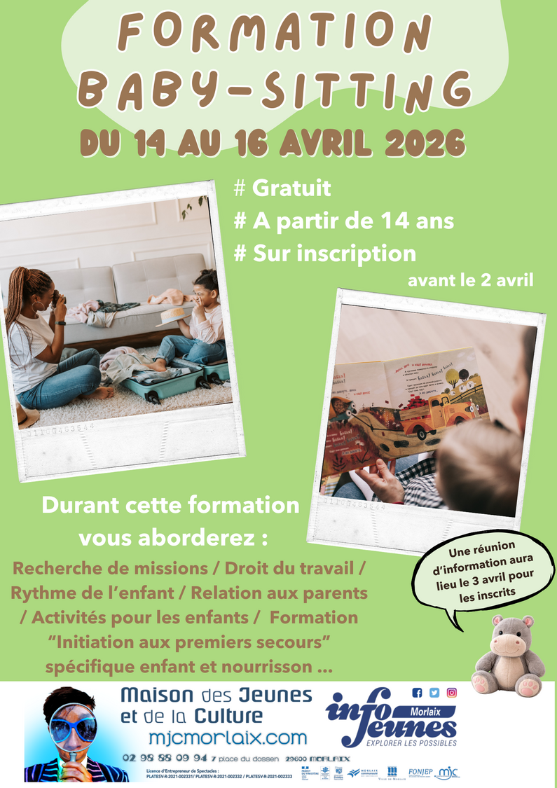 Le service formation jeunesse de la MJC de Morlaix organise une formation gratuite de Baby-sitting du 14 au 16 avril à destination des jeunes de 14 à 25 ans de Morlaix communauté. Inscriptions avant le 2 avril. Informations suplémentaires ci-dessous